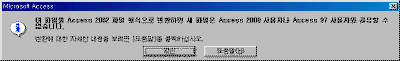 Access 2002´Â ±âº»ÀûÀ¸·Î Access 2000ÀÇ ÆÄÀÏ Çü½ÄÀ» Áö¿øÇÑ´Ù. µû¶ó¼­ ±âÁ¸ Access 2000¿¡¼­ ÀÛ¼ºµÈ µ¥ÀÌÅͺ£À̽º³ª ¼Ö·ç¼ÇÀ» »ç¿ëÇϸ鼭 ¹ß»ýÇÒ ¼ö ÀÖ´Â ¹®Á¦¸¦ ÃÖ¼ÒÈ­ÇÒ ¼ö ÀÖ´Ù. ÇÊ¿äÇÑ °æ¿ì µµ±¸ - µ¥ÀÌÅͺ£À̽º À¯Æ¿¸®Æ¼ - µ¥ÀÌÅͺ£À̽º º¯È¯ - Access 2002 ÆÄÀÏ Çü½ÄÀ¸·Î(2) ¸Þ´º¸¦ »ç¿ëÇÏ¿© Access 2002 Çü½ÄÀ¸·Î º¯È¯ÇÏ¿© µ¥ÀÌÅͺ£À̽º¸¦ º¸´Ù ½±°Ô Çϰí È¿À²ÀûÀ¸·Î µ¥ÀÌÅ͸¦ ó¸®ÇÒ ¼ö ÀÖ´Ù.