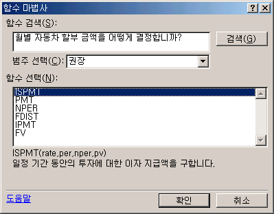 ÇÔ¼ö ¸¶¹ý»ç¸¦ ½ÇÇàÇØ º¸¸é ´Þ¶óÁø ÇÔ¼ö ¸¶¹ý»ç ´ëÈ­ »óÀÚ¸¦ º¼ ¼ö ÀÖ´Ù. ÇÔ¼ö¸¦ °Ë»öÇÒ ¶§´Â "¿ùº° ÀÚµ¿Â÷ ÇҺΠ±Ý¾×À» ¾î¶»°Ô °áÁ¤Çմϱî?"¿Í °°ÀÌ ÀÏ»óÀûÀÎ ¹®ÀåÀ¸·Î Áú¹®À» ÀÔ·ÂÇÒ ¼ö ÀÖ°í, ÀÌ¿¡ µû¸¥ °Ë»ö ÇÔ¼ö¸¦ Ç¥½ÃÇØ ÁØ´Ù.