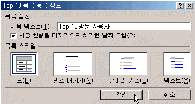 ¨è ±¸¼º ¿ä¼Ò Á¾·ù¿¡¼­ Top 10 ¸ñ·ÏÀ» ¼±ÅÃÇÏ°í »ç¿ë ÇöȲ ¸ñ·Ï ¼±Åÿ¡¼­ ¸ñ·ÏÀ¸·Î ÀÛ¼ºÇÒ ³»¿ëÀ» ¼±ÅÃÇÑ´Ù. ¸¶Ä§ ´ÜÃ߸¦ Ŭ¸¯ÇÑ´Ù.