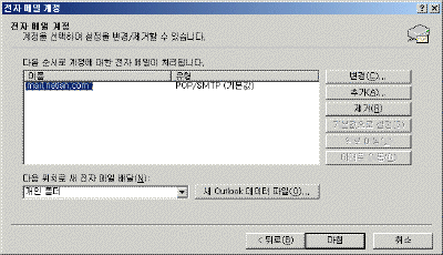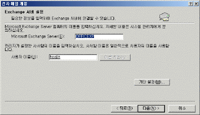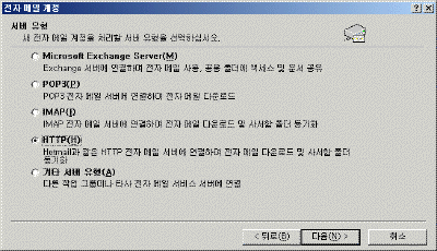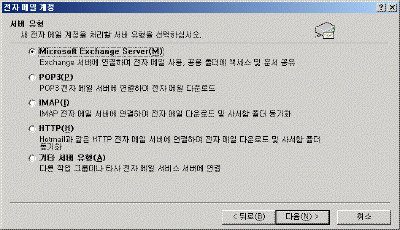 ÀÌÀü ¹öÀü¿¡¼­´Â Microsoft Exchange Server¸¦ »ç¿ëÇÏ·Á¸é ¾Æ¿ô·è¿¡¼­ ÀüÀÚ ¸ÞÀÏ ¼­ºñ½º ´Ù½Ã ±¸¼º¿¡¼­ ȸ»ç ¶Ç´Â ÀÛ¾÷±×·ì ¿É¼Ç¶õÀ» ¼±ÅÃÇÑ ÈÄ ¾Æ¿ô·èÀ» Àç½ÇÇàÇØ¼­ Microsoft Exchange Server ¸ÞÀÏ °èÁ¤À» µî·ÏÇßÁö¸¸ ¾Æ¿ô·è 2002¿¡¼­´Â ¾Æ¿ô·èÀ» ºüÁ® ³ª°¡Áö ¾Ê°íµµ POP3¸¦ ÁöÁ¤ÇÏ´Â ¹æ¹ý°ú µ¿ÀÏÇÏ°Ô Exchange Server ¸ÞÀÏ °èÁ¤À» µî·ÏÇÒ ¼ö ÀÖ´Ù.
