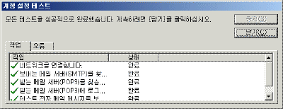 ÇöÀç ¼³Á¤µÇ¾î ÀÖ´Â ÀüÀÚ ¸ÞÀÏ °èÁ¤¿¡ ´ëÇØ ¸ÞÀÏÀ» ÁÖ°í ¹ÞÀ» ¶§ ³×Æ®¿öÅ©»ó¿¡ ¹®Á¦°¡ ÀÖ´ÂÁö ¾ø´ÂÁö Ã¼Å©ÇØ º¼ ¼ö ÀÖ´Ù. µµ±¸-ÀüÀÚ ¸ÞÀÏ °èÁ¤ ¸Þ´º¿¡¼­ ±âÁ¸ÀÇ ÀüÀÚ ¸ÞÀÏ °èÁ¤ º¸±â ¶Ç´Â º¯°æÀ» ¼±ÅÃÇÑ ÈÄ ÀüÀÚ ¸ÞÀÏ °èÁ¤À» ¼±ÅÃÇÏ°í º¯°æ ´ÜÃ߸¦ Ŭ¸¯ÇÏ¿© ´ëÈ­ »óÀÚ°¡ ³ª¿À¸é °èÁ¤ ¼³Á¤ Å×½ºÆ® ´ÜÃ߸¦ Ŭ¸¯ÇÑ´Ù.