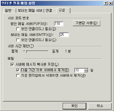 ¨í ÇöÀç ¼³Á¤µÈ ¸ÞÀÏ °èÁ¤À» Àå¼Ò¿Í »ó°ü¾øÀÌ ¼­¹ö¿¡ ÀúÀåµÇ¾î ÀÖ´Â ¸ÞÀÏÀ» È®ÀÎÇÏ·Á¸é º¯°æ ´ÜÃ߸¦ Ŭ¸¯ÇÑ ÈÄ ÀÎÅÍ³Ý ÀüÀÚ ¸ÞÀÏ ¼³Á¤(POP3) ´ëÈ­ »óÀÚ¿¡¼­ ±âŸ ¼³Á¤ ´ÜÃ߸¦ Ŭ¸¯ÇÏ°í °í±Þ ÅÇ¿¡¼­ ¼­¹ö¿¡ ÆíÁö º¹»çº» ÀúÀåÀ» üũÇÏ¸é µÈ´Ù.