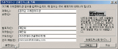 ¨è ÇÁ·¹Á¨Å×À̼ÇÀÇ Á¦¸ñ°ú ¹ßÇ¥ÀÚ, ÀüÀÚ ¸ÞÀÏ µîÀ» ÀÔ·ÂÇÑ´Ù. ºê·Îµåij½ºÆ®´Â ³×Æ®¿öÅ© ȯ°æ¾ÈÀÇ Æú´õ¿¡¸¸ ÀúÀåÇÒ ¼ö ÀÖ´Ù. ¼³Á¤ ´ÜÃ߸¦ Ŭ¸¯ÇÑ´Ù.