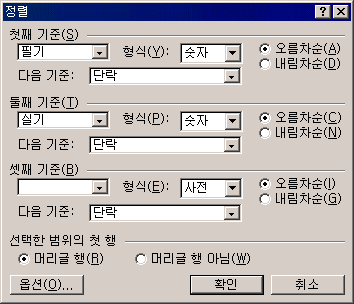 ¨è Á¤·Ä ´ëÈ­ »óÀÚ°¡ ³ªÅ¸³ª¸é Á¤·Ä ±âÁذú ¹æ¹ýÀ» ¼³Á¤ÇÑ´Ù. Á¤·ÄÇÒ ±âÁØÀÌ ÇϳªÀ̸é ù° ±âÁظ¸ ¼³Á¤ÇÏ¸é µÇ°í, ¿©·¯ ±âÁØÀ» µÎ¾î Á¤·ÄÇÒ °æ¿ì¿¡´Â ¿ì¼± ¼øÀ§¿¡ µû¶ó ù°, µÑ°, ¼Â° ±âÁØÀ» ¼³Á¤ÇÑ´Ù. °¢ ±âÁØ¿¡ µû¶ó Á¤·Ä Çü½Ä(¼ýÀÚ, »çÀü, ³¯Â¥, KSÄÚµå)°ú ¹æ¹ý(¿À¸§Â÷¼ø, ³»¸²Â÷¼ø)À» ÁöÁ¤ÇÑ´Ù.